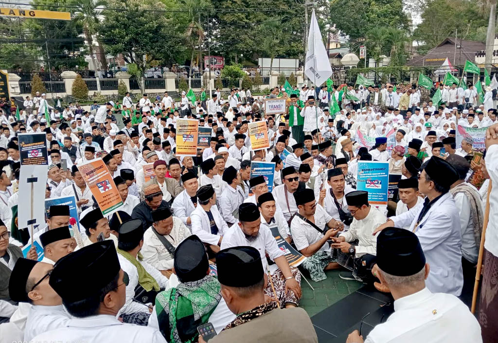 isnukabmalang.com – Ribuan santri dan kiai ikuti Aksi Jumat Putih di Polres Malang, Jumat (17/10/2025). Aksi damai ini merupakan seruan dari Pengurus Cabang Nahdlatul Ulama (PCNU) Kabupaten Malang guna menyikapi tayangan Xpose Uncensored TRANS7 pada Senin (13/10/2025) yang menampilkan narasi negatif kiai dan pesantren.